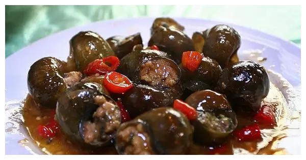 酿田螺是清远喜爱的吃法,先将田螺肉挖出,与肉末等食材一起剁碎然后再酿入到田螺壳里烹饪而成。肉质鲜嫩,香味独特,让人越吃越上瘾。