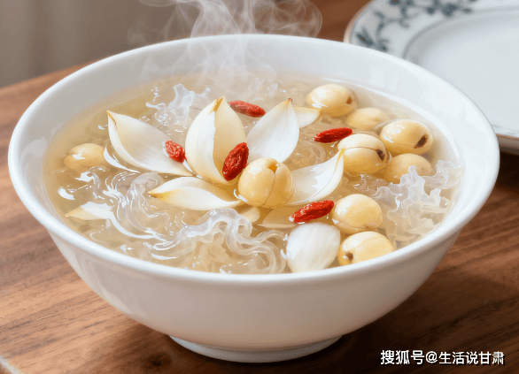 百合银耳莲子羹,兰州的主妇们会用心熬制一锅温暖的甜羹。胶质丰盈的银耳、软糯的莲子,与兰州百合在糖水中慢火相融。百合在最后时刻入锅,保持形态不散,舀一勺送入口中,温润的汤汁顺着喉咙滑下,抚平所有干燥与不适,一夜安眠便从这碗羹开始。