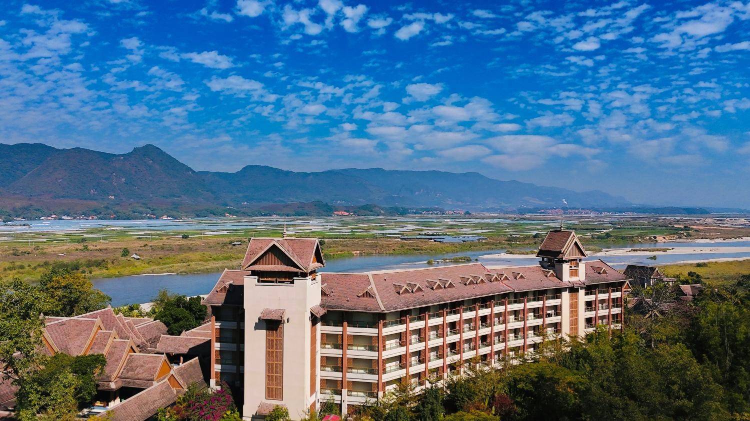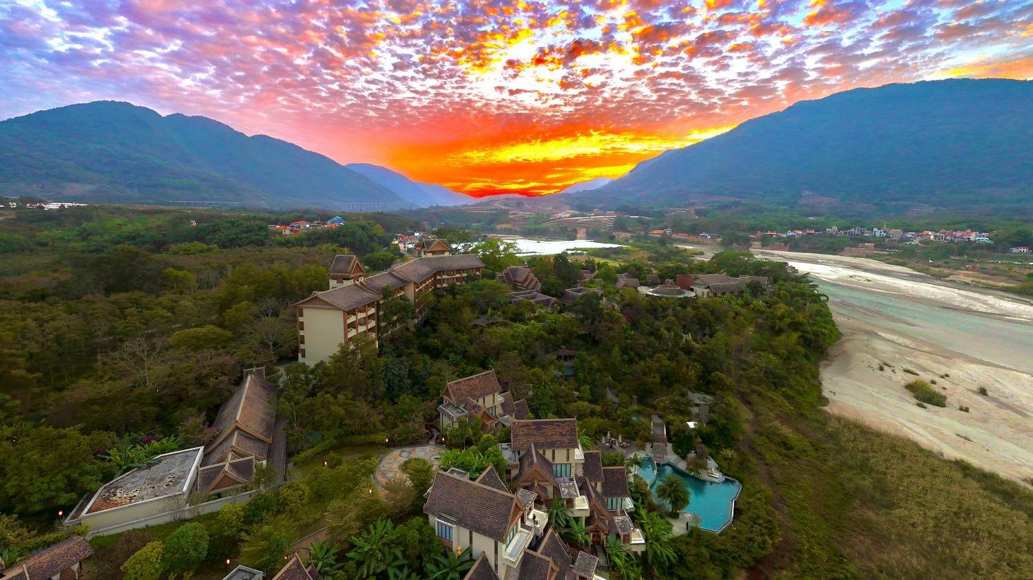 坐落于景区内的翡华温泉度假酒店依江畔而建的主楼建筑群加之别墅,整体建筑形态体现了当地民族文化与东南亚文化的融合。在设计之初就融入了自然保护的理念,认真衡量建筑和自然之间的密切关系,设计上巧妙运用了原生的树木,尊重自然、融入自然,使整个酒店藏在山间、隐没林中,建筑物与自然景观融为一体,叠级式的建筑让人饱览无垠的瑞丽江及山河田园风光。