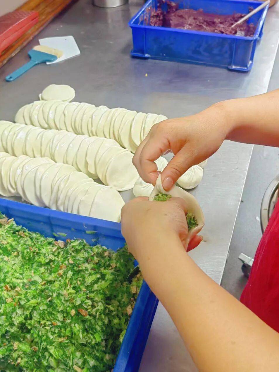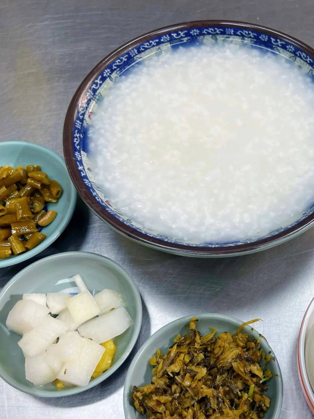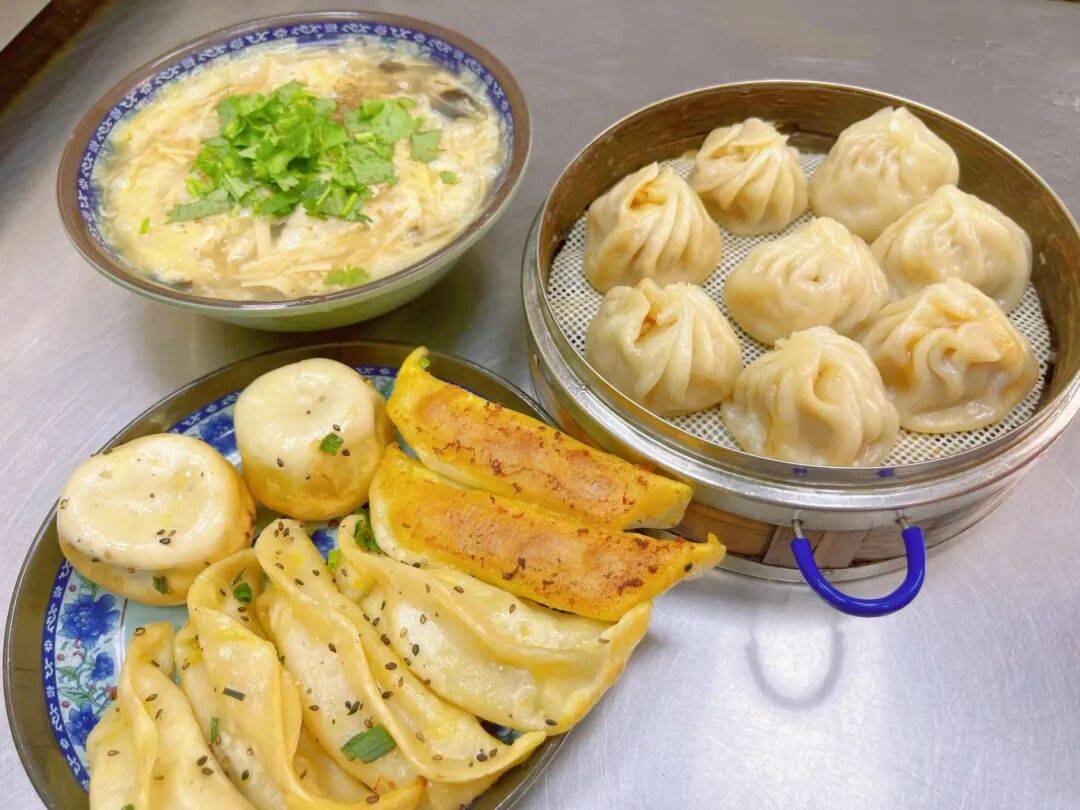 除了这碗招牌汤,店里还有各色面点供食客们挑选。每天凌晨一两点,老板和家人就开始包包子,坚持现切现包,就为了留住菜包里那抹鲜亮的翠绿。入乡随俗后,他还专门拜师学做小笼包和生煎,每天天不亮就熬上一锅绵密的白米粥,配上爽口的咸菜、腌萝卜和酸豆角,连咸鸭蛋和油条也一应俱全,无论是南方人还是北方人,都能在这里找到合意的那一口。