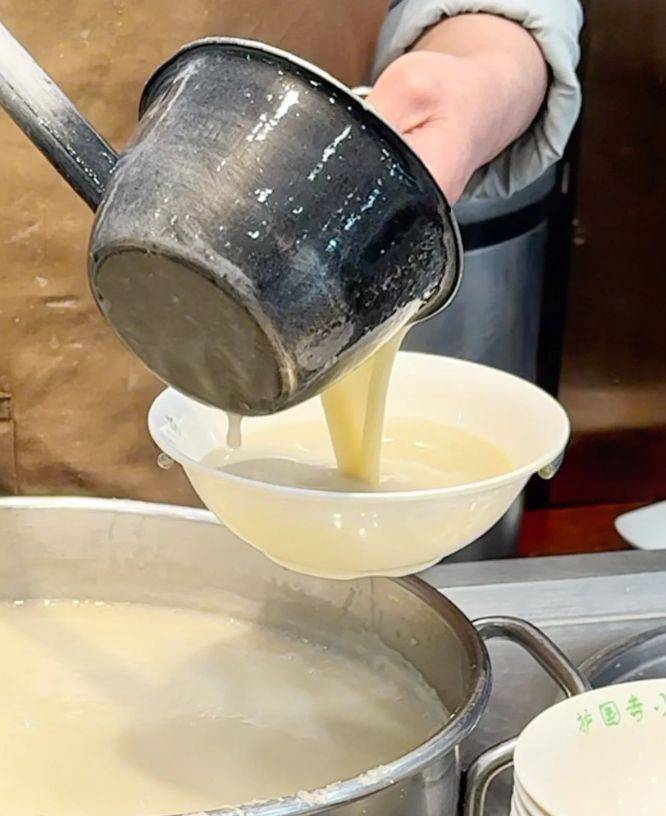 豆汁并非豆浆,它是绿豆制作粉丝、淀粉后剩余的发酵液,经过沉淀和熬煮,呈现出灰绿的颜色和独特的酸涩口感。老师傅熬豆汁讲究火候,需用小火慢煨,防止糊底,还要时不时扬汤止沸,让水淀粉充分融合,最终成就一碗浓稠滑润、酸中带香的浆液。喝豆汁是一门学问,不能细品,得沿着碗边转着圈地吸溜,初入口的酸烈之后,回甘便慢慢浮上舌尖。